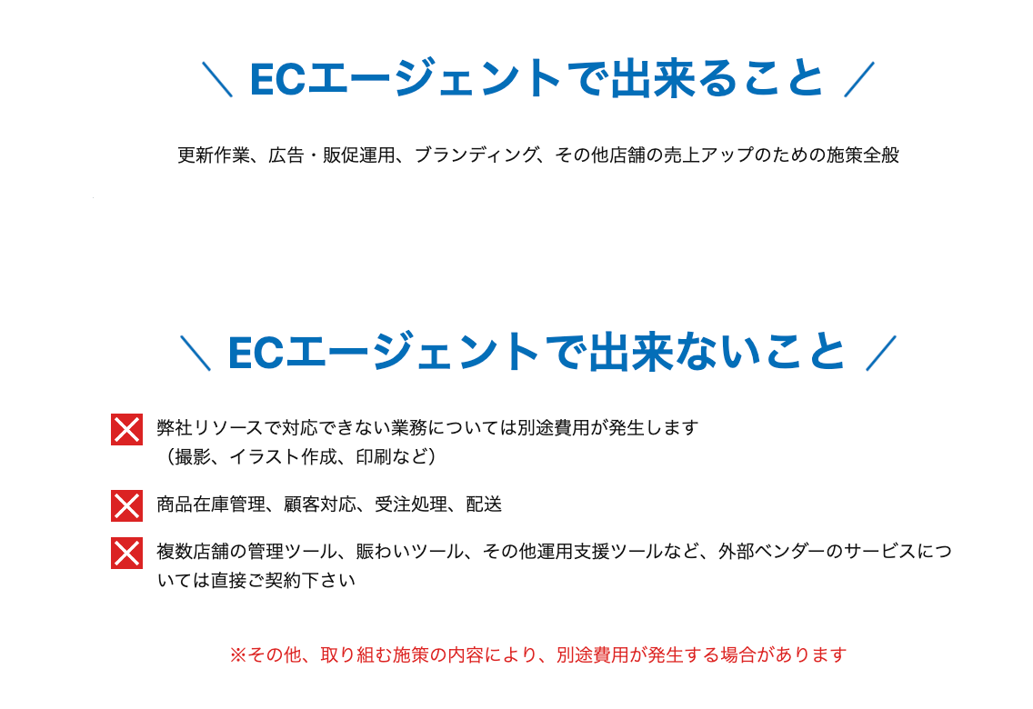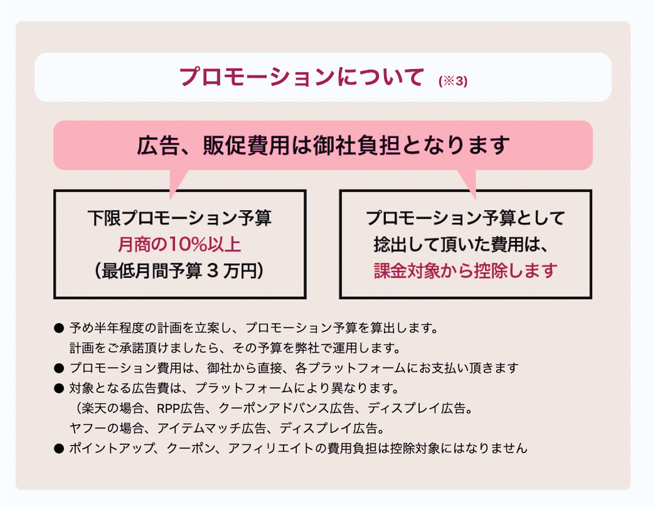 「徹底的な分析と具体的な施策」 市場分析、競合調査、施策分析を徹底的に行い、分析結果をもとに具体的な施策案を提案します。運営代行の場合、戦略を戦術に落とし込み、ROAS最大化を図るRPP広告の実施、戦略的SEO対策代行において完全実行を行います。